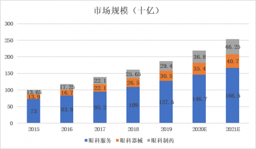 眼科医疗产业主要包括眼科器械、眼科服务以及眼科制药三个大板块,下图为各板块市场规模。眼科服务仍占据大部分的市场,但从增速来看,眼科器械、眼科制药与眼科服务所对应的过去5年复合增速分别为21.71%、21.14%、16.97%,眼科器械增速最快。