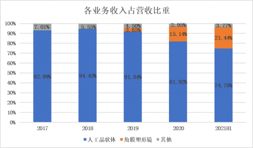 上文提到了爱博医疗目前主要产品为人工晶状体及角膜塑形镜,下图则是公司近年来各业务收入占营业收入的比重变化,我们可以看出,公司的收入来源主要是人工晶状体,角膜塑形镜近两年有较快的发展,这主要是因为公司角膜塑形镜产品在2019年3月才获批上市,虽然目前仍处于发展初期,但公司凭借独特的产品设计、多样化的市场推广,使得其销量快速增长,2020年全年突破10万片。角膜塑形镜的快速发展也在一定程度上缓解了公司单一产品的风险。