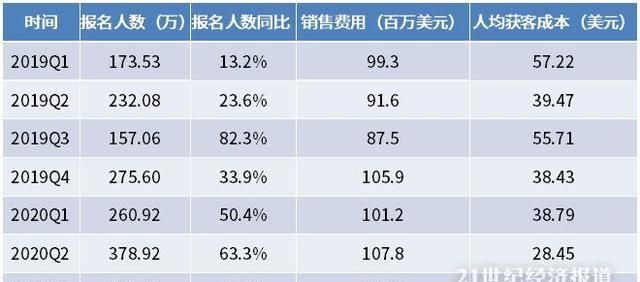 由于周期性原因,公司第三季度总体上是注册的淡季,但从上表可以看出,公司2019年第三季度也实现了82.3%的同比增长率。2020财年第三季度,申请人数仅为166.1万,同比增长2.3%。这也是自2019年以来最低的同比增长率。