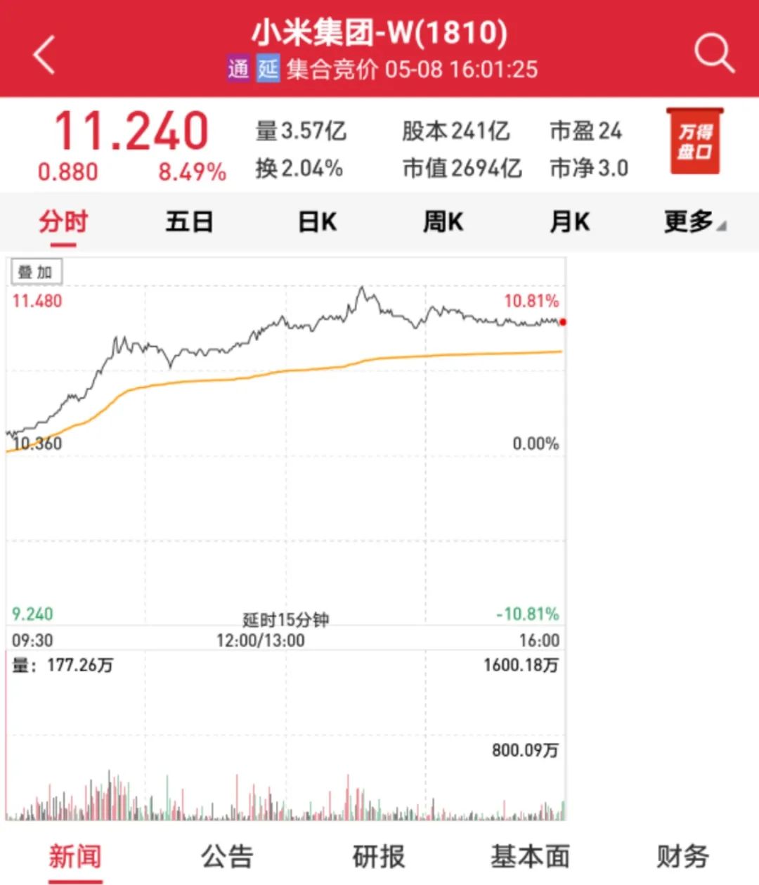 小米集团在周三大幅上涨后,销量再次强劲增长。今天的股价大幅上涨,下午涨至10.81%,至每股11.48元,为3月中旬以来的新高。