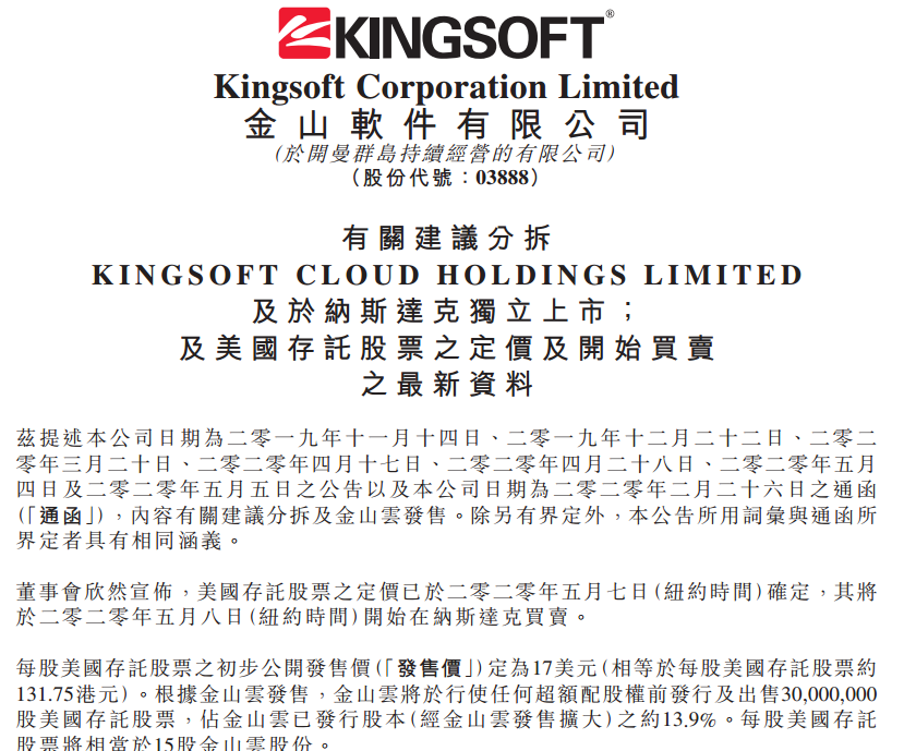 金山软件在香港证券交易所发布公告,金山云在美国的首次公开募股价格定为每股17美元。该公司将于今晚5月8日(纽约时间)在纳斯达克开始交易,代码为“KC”,承销商包括摩根大通、瑞银、瑞士信贷和CICC。金山云发行了3000万股美国股票,约占金山云已发行股本的13.9%(因金山云出售而扩大)。