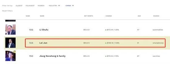 根据雷军在小米27.69%的股份,雷军的净资产在一天内增加了57亿港元。根据雷军在小米的股份,他在小米的市值为748.7亿港元。据《福布斯》实时数据显示,雷军目前身价109亿美元(相当于845亿港元),在内地富豪榜上排名第19位。