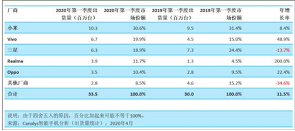 根据世界权威研究机构Canalys的数据,小米今年第一季度在印度市场销售了约1030万部智能手机,市场份额为30.6%,位居第一。Vivo首次超过三星,以19.9%的市场份额排名第二。第三名是三星,出货量为630万台,市场份额为18.9%。Realme和OPPO分别以11.7%和10.4%的市场份额排名第四和第五。