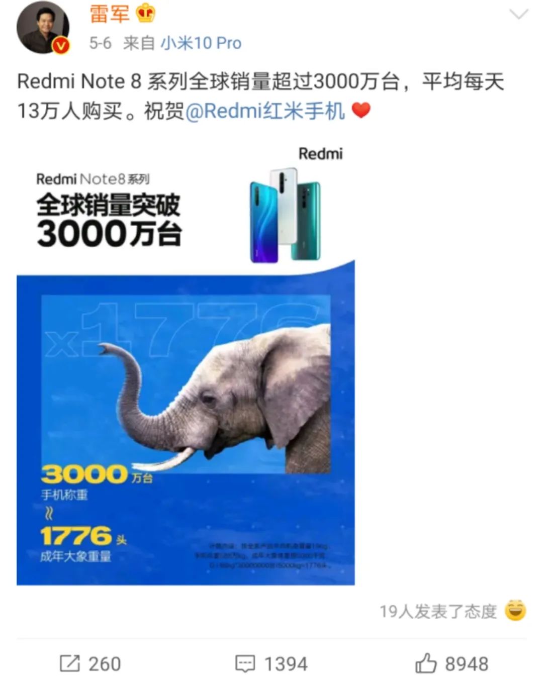 5月6日中午,雷军发推称,Redmi Note 8系列在全球销量超过3000万台,平均每天有13万人购买。