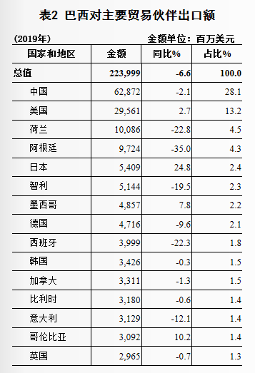 据巴西统计,2019年巴西对华出口总额达到628.72亿美元,占巴西出口总额的28.1%。对美出口总额仅为295.61亿美元,不到对华出口总额的一半。第三位是荷兰,巴西向荷兰出口了100.86亿美元的商品,占巴西出口总额的4.5%。