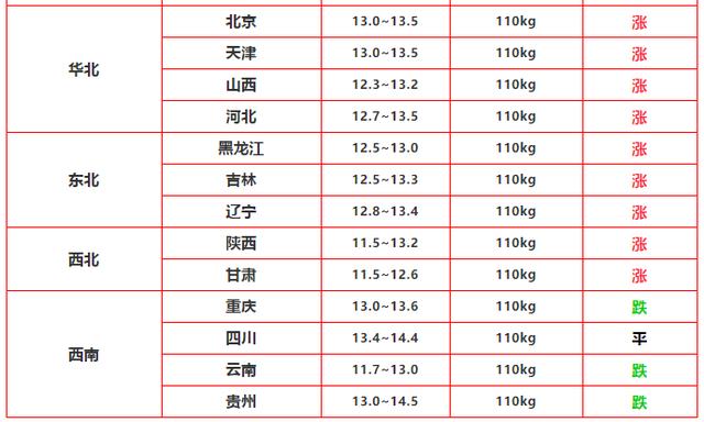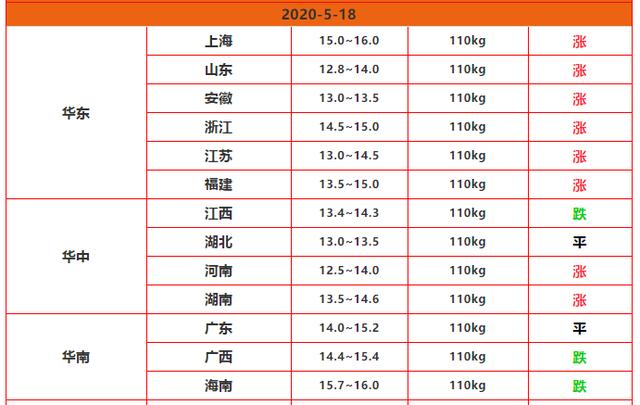 最后,让我们看看5月18日的生猪价格。中国东部生猪价格上涨,最低价格回到12.8元,最高价格回到16元。在中国中部,最高价格回到14.6元,而最低价格是12.5元。中国南方经历了一次平局和两次下跌,最低价格为14元,最高价格为16元。华北股市全线上涨,最高价为13.5元,最低价为12.3元。东北地区全线上涨,最高价为13.4元,最低价为12.5元。中国西北地区全线上涨,最高价为13.2元,最低价为11.5元。中国西南地区下跌1-3,最高价为14.5元,最低价为11.7元。