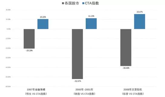 这是因为CTA基金可以双向交易。因此,无论市场是上涨还是下跌,CTA基金都有机会获得收益。在一些极端的市场环境中,股票市场通常会大幅下跌,一些CTA策略很少能抓住这个机会。在熊市周期中,传统的投资策略往往会招致明显的损失,而优秀的CTA策略反而会获得可观的利润,这将有助于资产组合。作为大类资产配置中不可或缺的项目,CTA也是应对熊市的利器。