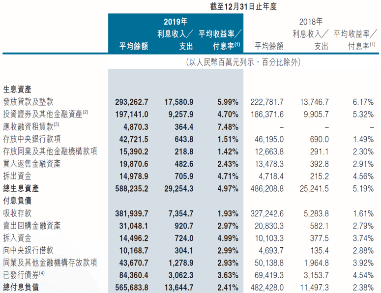 2019年,中原银行仅存中央银行资金和贷款的生息资产平均收益率分别小幅上升0.02个百分点和0.15个百分点,其他生息资产平均收益率普遍下降,贷款和垫款下降0.18个百分点。