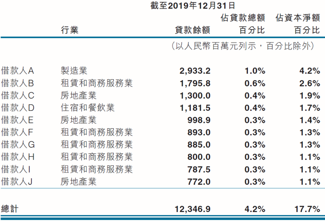 值得注意的是,2019年中原银行的租赁和业务服务贷款跃升至首位,这可能与收购银行金融租赁有关。此外,该行前10名借款人几乎被租赁和商业服务行业以及房地产行业垄断。租赁和商业服务业在前10名借款人中占5席,房地产业占3席,制造业和住宿餐饮业各占1席。