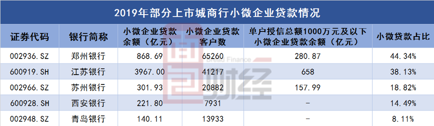 在郑州银行、江苏银行、苏州银行、青岛银行等五家上市城市商业银行中,Xi银行的小微企业贷款客户数量最低,小微企业贷款余额和贷款比例仅高于青岛银行。